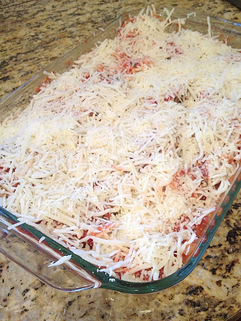 Pour all of the sauce over the eggplant rounds. (I lifted a few rounds from the top layer and shoved some sauce in between the layers, just so the sauce is all over each round.) Top the sauce with the shredded cheese in an evenly distributed layer.